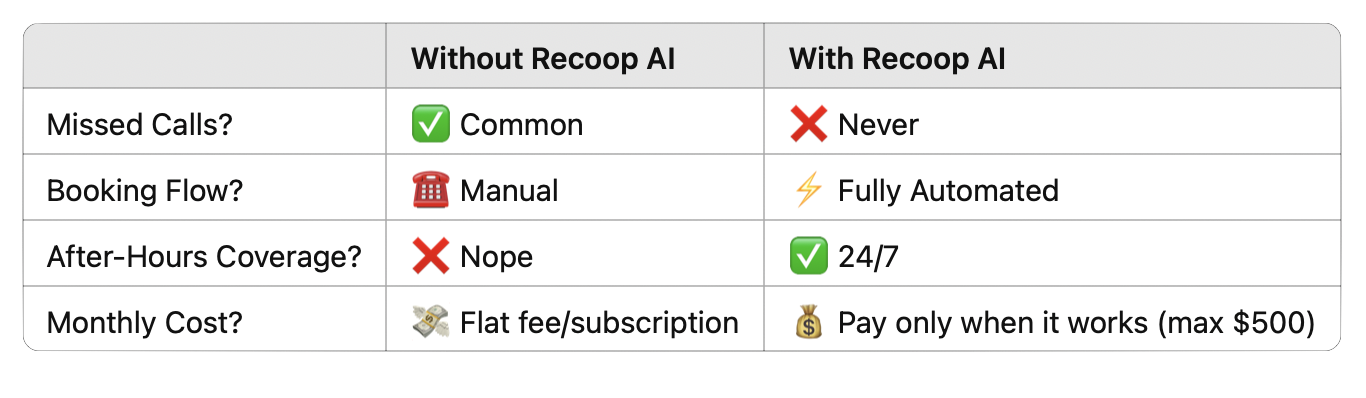 "Recoop AI has been a total game-changer. I used to miss so many calls while working with clients — now everything’s handled automatically, and my schedule stays full without the stress. The best part? I didn’t pay anything upfront. It literally pays for itself."